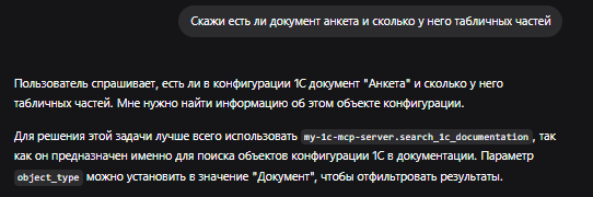 После этого в чате на боковой панели должны появиться инструменты наших MCP (search-1s-documentation и 1s-syntax-helper)