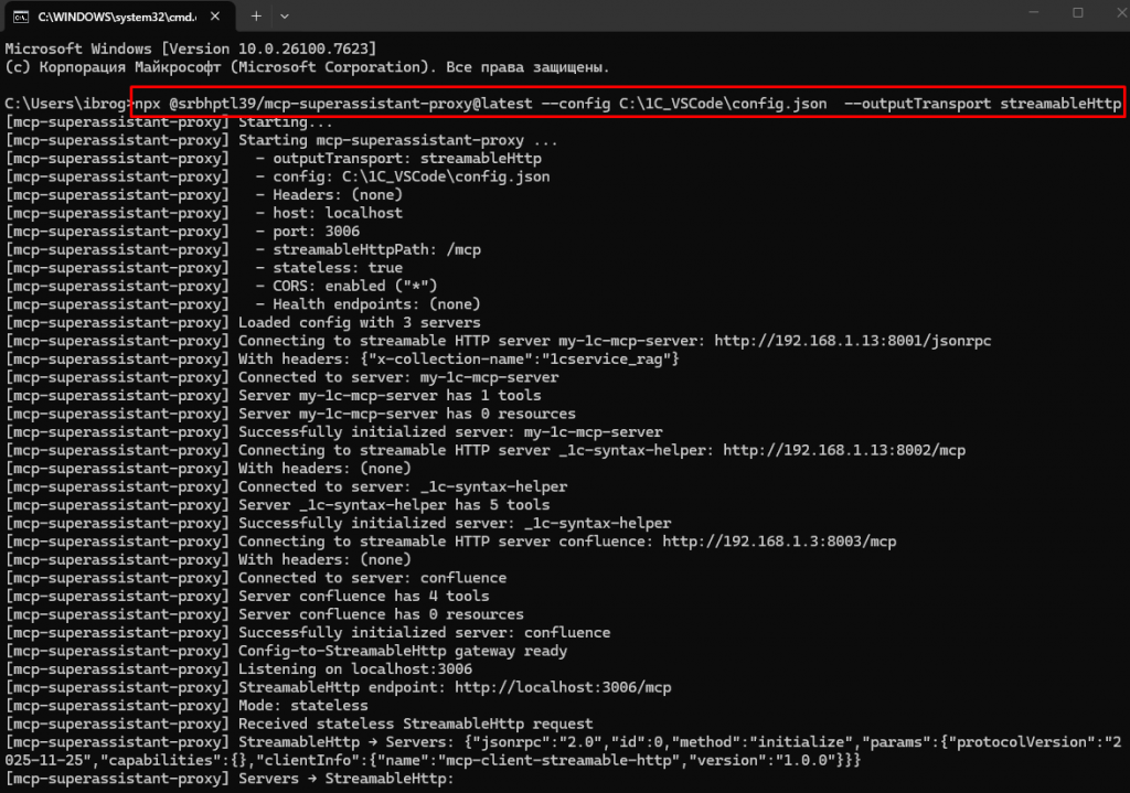 2. Запуск прокси: Через командную строку (CMD) запустите мост командой: npx @srbhptl39/mcp-superassistant-proxy@latest --config C:\ПутьКПапке\config.json --outputTransport streamableHttp