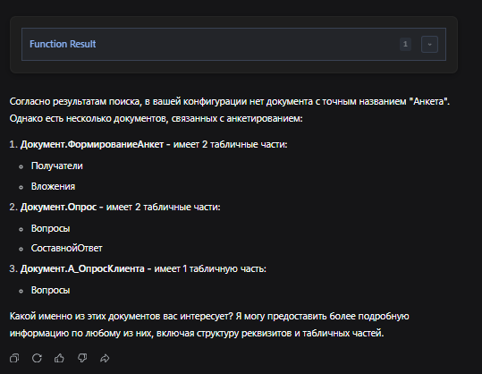 2. DeepSeek: Допустил пару ошибок (например, пытался использовать метод НайтиПоРеквизиту для номера), но после ручных правок или уточняющих запросов код успешно выполнил задачу.