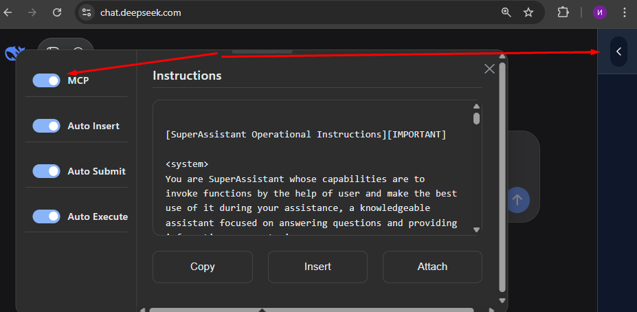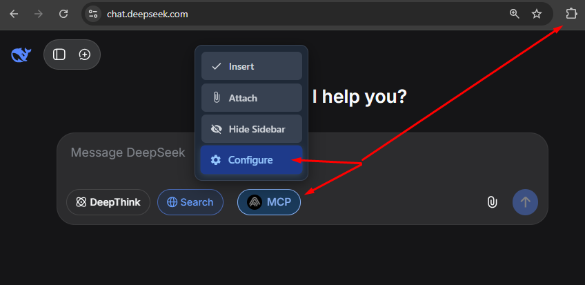 После включения расширения в строке чата c ИИ (например, в deepSeek) должна появиться кнопка MCP