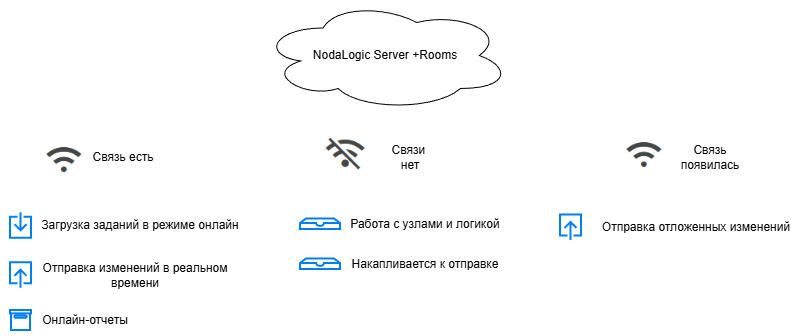 - По возможности идет отправка изменений в сервер (в виде обновленных данных). Если связи нет, то отправляет потом