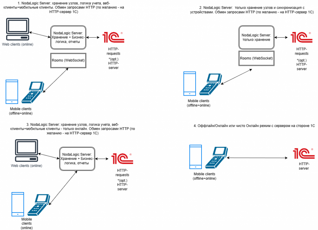 Укрупненно показал другие варианты архитектуры решений. Наш вариант - №1. Возможно, чаще для 1С будет №2. Тут все гибко – можно использовать только мобильную платформу, другие транспорты для данных, другое хранение как на сервере, так и на мобильном устройстве, да и логику необязательно делать на узлах.