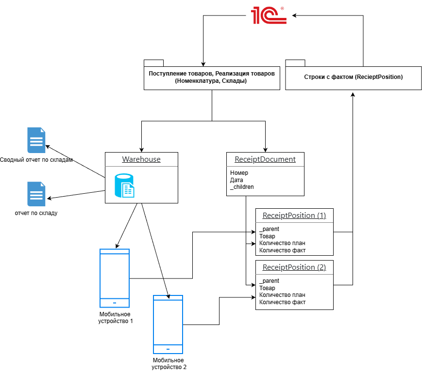 - На сервер приходят документы из 1С: Приемки, Отгрузки (допустим ЗаказПоставщику, ЗаказКлиента), с ними: Товары (Номенклатура+Штрихкоды,Артикулы) , Склады