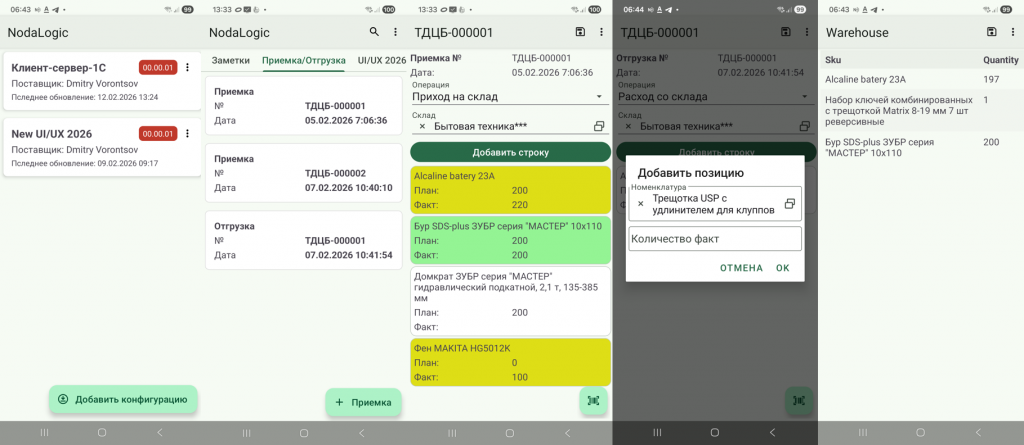 - В мобильном клиенте происходит работа как вручную с документами, так и с помощью сканера (аппаратного или программного), фиксируют факт, при необходимости добавляют строки и т.д.