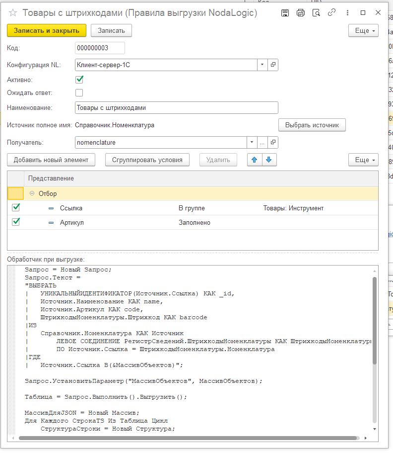 2. Создать правила выгрузки и загрузки, используя отборы СКД для справочников и документов. В каждом правиле мы имеем МассивОбъектов, который используем как основу выгрузки, делаем JSON наподобие этого. И даем его функции выгрузки запроса. Ничего сложного, шаблон формируется автоматически