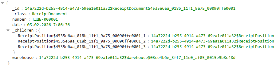 Вот схема решения. Изображенная структура узлов существует на сервере и та же самая конфигурация на мобильном клиенте. RecieptPosition - строки документа, на них вся активность, RecieptDocument - корневой документ (и отгрузка и приемка), Warehouse - склад как ссылка и по совместительству - хранилище транзакций и итогов (как РегистрНакопления в 1С)