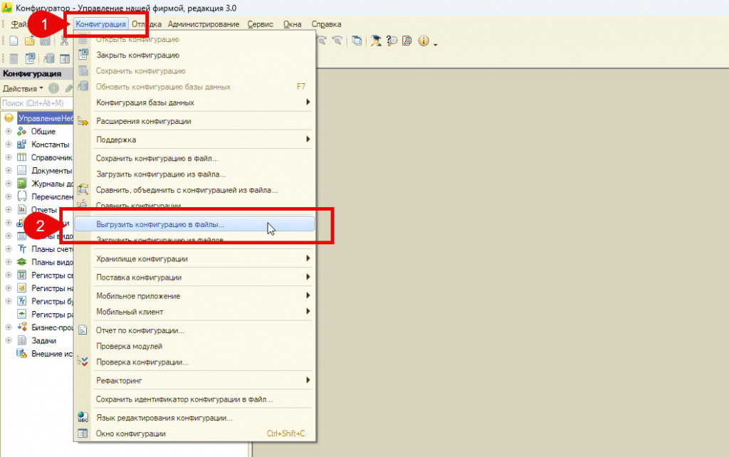 - Выгрузите конфигурацию в папку (операция длительная)