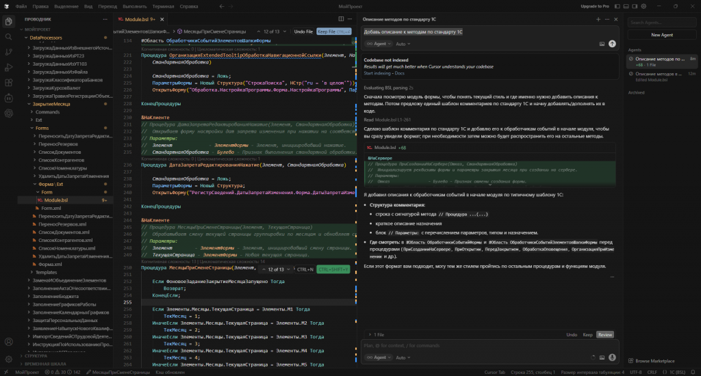 Cursor → Open Folder → выбираете папку проекта. - Откройте обработку (DataProcessor-ЗакрытиеМесяца-Forms-Форма-Form-Module.bsl или другую) и напишите первый промпт: