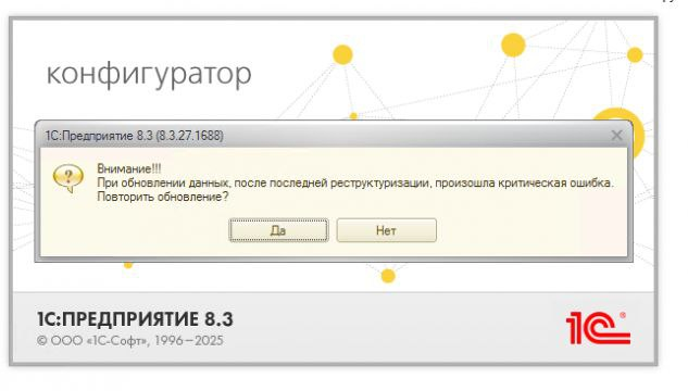 С похожей ошибкой сталкивался при динамическом обновлении. В этом диалоге жал "Да". К счастью, 1С не падала.