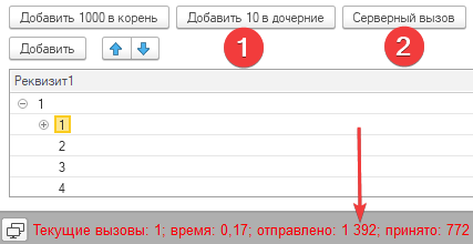 Теперь запускаем форму на платформе 8.3.27 и с включенными показателями производительности наблюдаем на числом переданных байт (показатель "Отправлено" в нижней области главного окна) в контекстных серверных вызовах после обоих видов добавления строк в дерево.