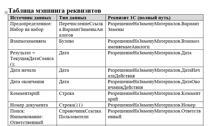 Первый результат настройки - документ Word с описанием всего маппинга. По сути это готовое техническое задание на загрузку: какой объект загружается, какие колонки Excel куда идут, какие условия применяются. Такой документ удобно согласовывать с заказчиком, передавать в команду или хранить как проектную документацию.
