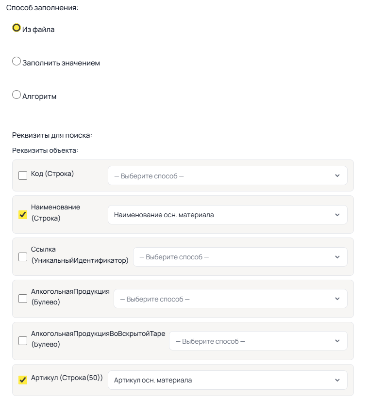 • Из файла - значение берётся из указанной колонки Excel. Для ссылочных реквизитов (Номенклатура, Контрагент и т.д.) можно настроить поиск объекта в базе по одному или нескольким свойствам, либо задать значение напрямую - если нужно записать строку как есть без поиска
