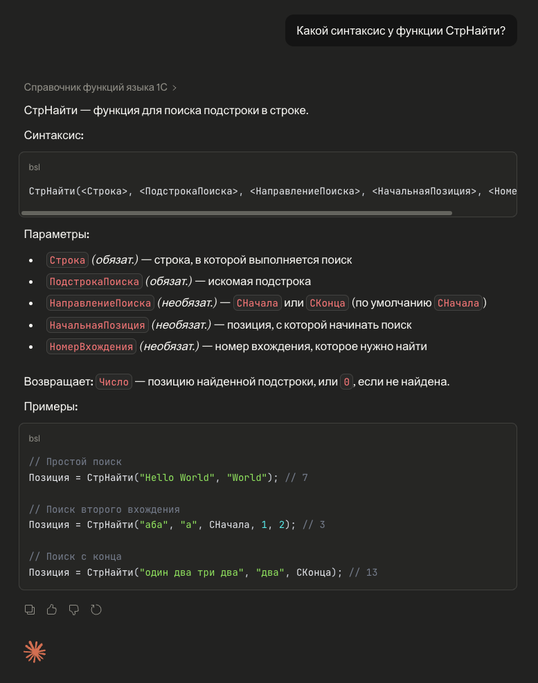 AI вызывает bsl_syntax_help и получает точное описание: параметры, возвращаемое значение, пример. Все на русском и английском. Работает без интернета, без запущенной 1С, без EDT.