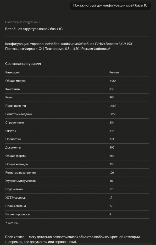 Перезапустите клиент. Спросите: «Покажи структуру конфигурации моей базы 1С» и убедитесь, что AI видит вашу базу.