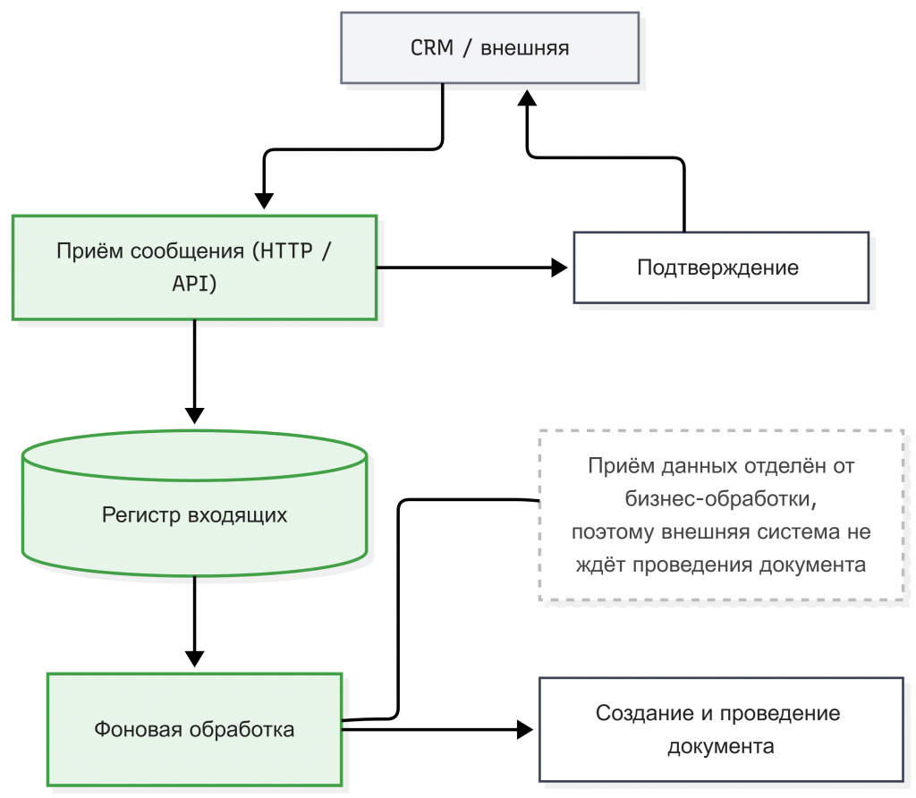 Первым и наиболее важным принципом является асинхронность взаимодействия. Приём данных не должен зависеть от выполнения тяжёлой бизнес-операции, потому что именно выполнение такой операции чаще всего занимает большую часть времени интеграционного запроса. Если интеграция построена синхронно, то внешний вызов фактически удерживает транзакцию системы до завершения всей бизнес-логики — создания документа, проведения, пересчёта регистров и других операций. В асинхронной модели эти этапы разделяются. Интеграционный сервис выполняет только приём и фиксацию сообщения, а сама бизнес-операция переносится в отдельный процесс обработки. Благодаря этому интеграционный вызов становится коротким и предсказуемым, а система перестаёт удерживать ресурсы базы данных внутри внешнего запроса.
