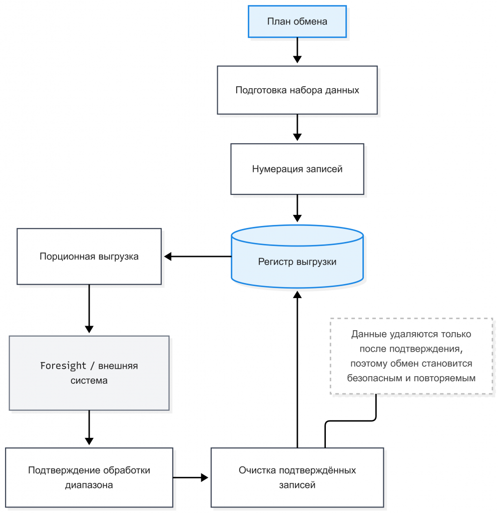 Ключевым элементом этой схемы стало подтверждение обработки данных. После успешной загрузки очередного диапазона записей система бюджетирования отправляла подтверждение, в котором указывался обработанный диапазон. Только после получения такого подтверждения соответствующие записи помечались как обработанные и могли быть очищены из регистра выгрузки.