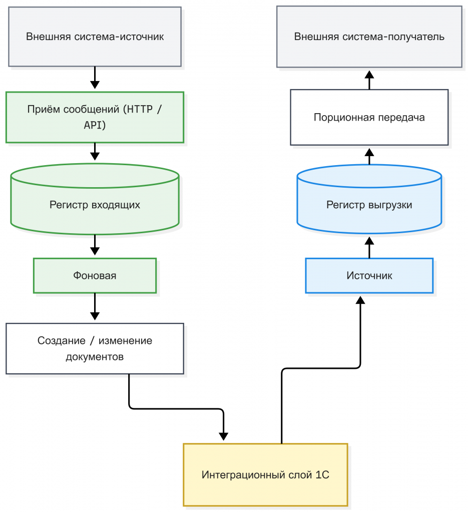 Если объединить все эти элементы, формируется универсальный архитектурный контур интеграции. Внешняя система передаёт сообщение, интеграционный сервис фиксирует его в очереди и возвращает подтверждение приёма. Далее фоновый процесс выбирает сообщения из очереди, выполняет бизнес-операцию и фиксирует результат обработки. Для исходящих данных система формирует стабильный набор записей, который внешние системы могут забирать порциями, подтверждая успешную обработку диапазонов. Благодаря такой архитектуре интеграции перестают зависеть от времени выполнения бизнес-операций, становятся устойчивыми к росту нагрузки и могут безопасно обрабатывать большие объёмы данных без риска таймаутов и потери информации.