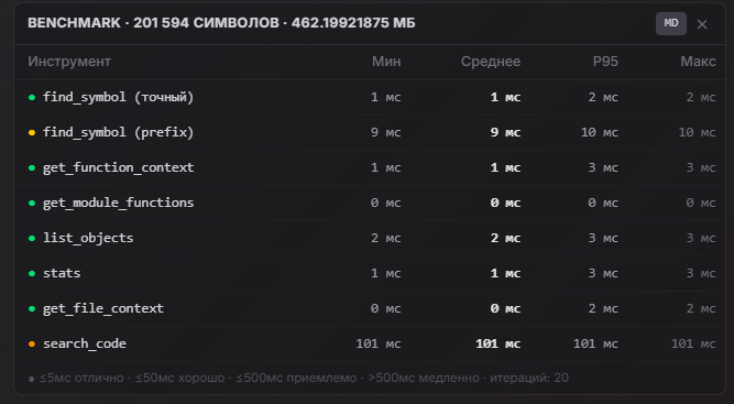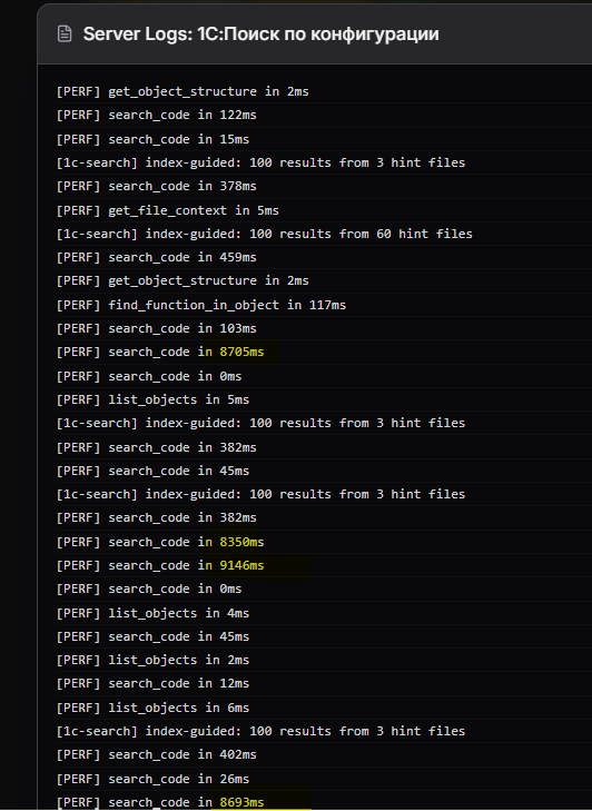 - 1С:Поиск по конфигурации — ИИ может сам найти, как конкретный метод уже используется в других местах вашей конфигурации, и взять это как пример. Работает по выгрузке конфигурации: индексирует файлы через SQLite, поддерживает инкрементальную синхронизацию (только изменённые файлы). Спокойно тянет конфигурации 20+ ГБ даже на HDD — первая индексация занимает несколько минут, потом обновляется быстро (бенчмарк). На практике очень выручает в больших конфигурациях, где всё уже написано, но поди найди.