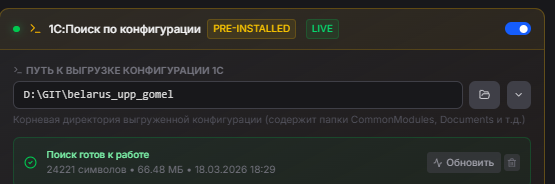 - 1С:Справка — доступ к актуальному синтаксис помощнику платформы 8.3. Модель видит реальное описание методов и их параметры, а не то, что она «помнит» из обучения.