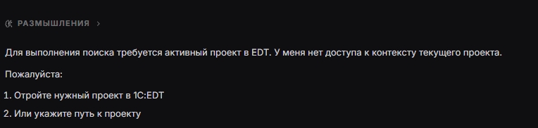 Когда задача не решается одним ответом, модель сама идёт по шагам: поищет функцию в конфигурации, проверит контекст, сверится со справкой — и только потом напишет решение. Каждый шаг виден в интерфейсе, ничего не происходит за кулисами.