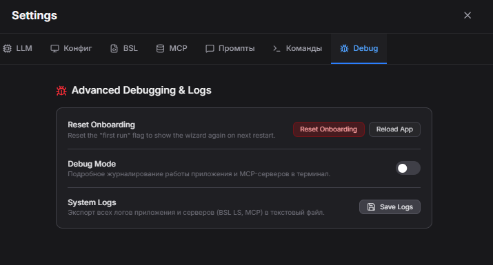Самая раздражающая вещь при работе ИИ с кодом 1С — он начинает выдумывать методы, которых не существует, или пишет код под реквизиты из головы. Чтобы с этим бороться, приложение использует протокол MCP (Model Context Protocol) — по сути, способ дать модели реальный контекст вашей работы.