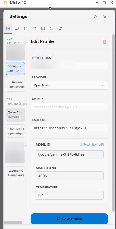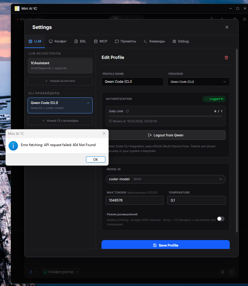 Ещё один вариант — 1С:Напарник как прямой ИИ-провайдер. Не MCP-прослойка, а именно модель: приложение подключается напрямую к code.1c.ai, достаточно вставить токен.