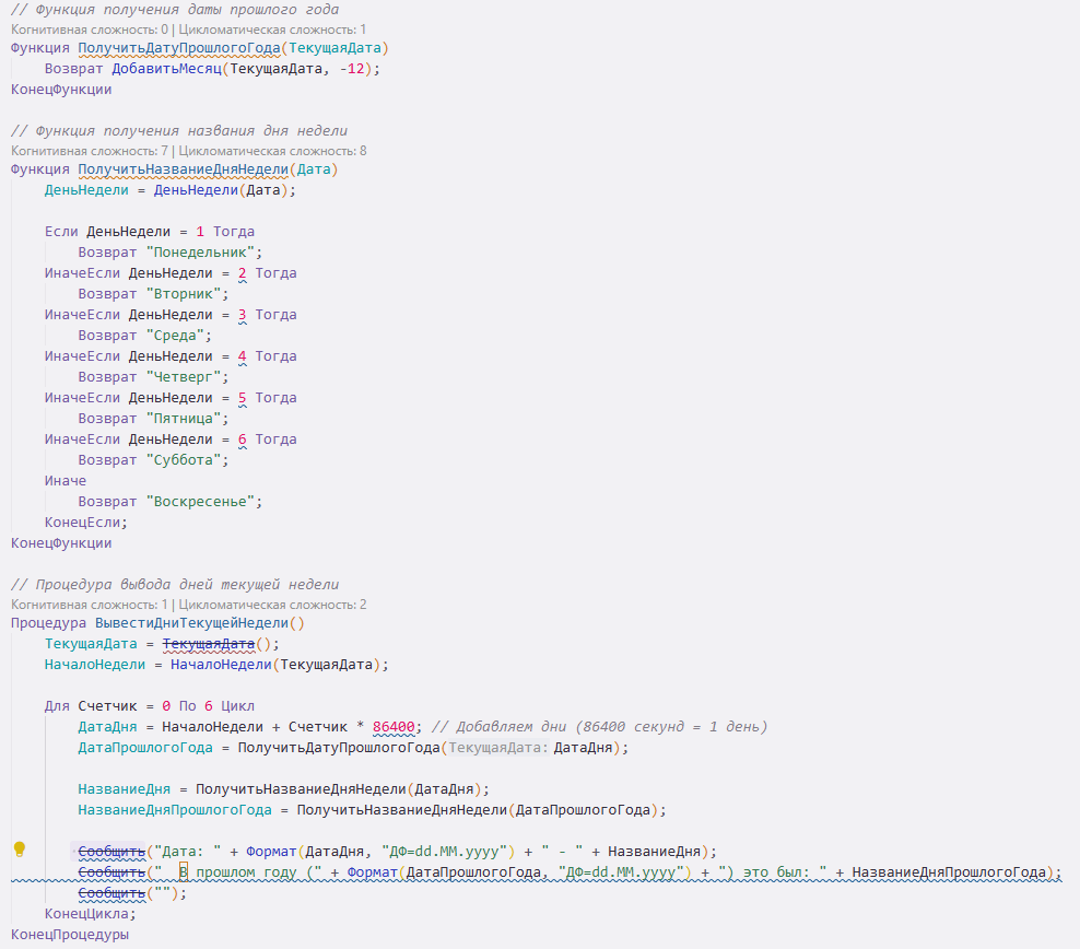 ПолучитьНазваниеДняНедели — избыточная функция; заменяется встроенным Формат(Дата, "ДФ=ддд"), что короче и надежнее.
