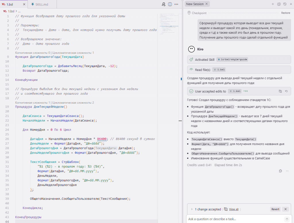 Результат: ИИ генерирует код enterprise-уровня автоматически, без правок промптов. Все стандарты 1С соблюдаются из коробки.