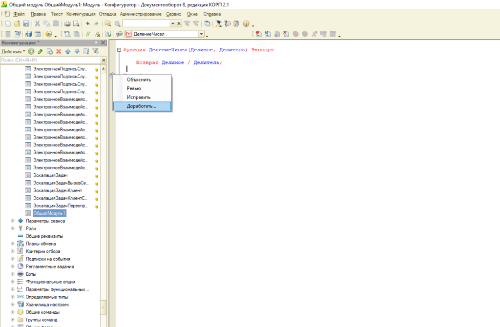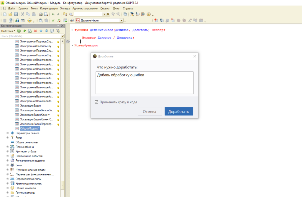 Выделите участок кода, который надо доработать или исправить, выберите соответствующий пункт в контекстном меню и опишите, что ИИ должен сделать. Либо можно просто установить курсор внутри функции или процедуры, если пожелание к доработке относятся ко всему методу. Предложенная доработка или исправление сразу же будет применено и отразится в Конфигураторе.