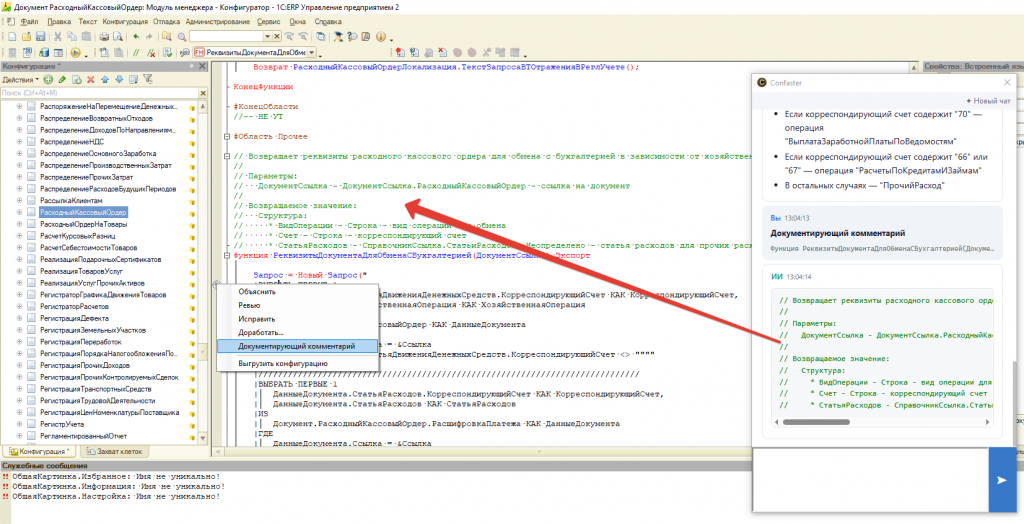Установите курсор внутри процедуры или функции, выберите действие «Документирующий комментарий» — и ИИ сгенерирует полное описание: назначение, параметры и возвращаемое значение. Готовый комментарий автоматически вставляется перед методом.