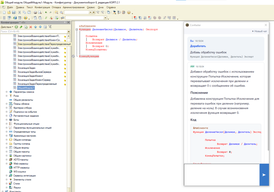 Теперь полноценная работа с ИИ доступна не только в 1C:EDT, но и в классическом Конфигураторе. Не надо больше переключаться между чатом с ИИ и Конфигуратором, копировать и вставлять код. Confaster работает прямо внутри Конфигуратора, видит весь код текущего модуля. А если сделать выгрузку конфигурации, то подключится еще и локальный MCP сервер, который поможет ИИ ориентироваться по всей конфигурации.