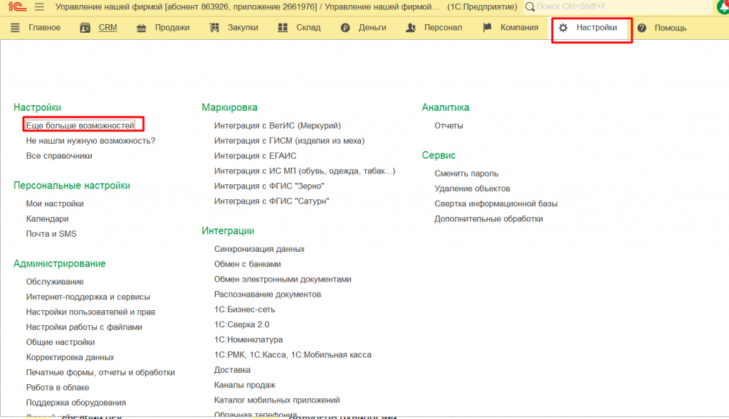 1С:УНФ — Настройки — Ещё больше возможностей