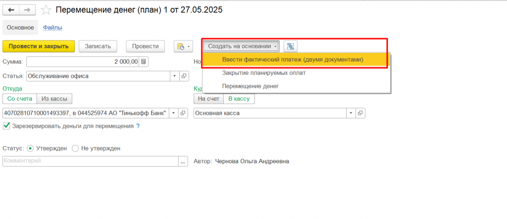 Перемещение денег (план) — Создать на основании — Внести фактический платеж (двумя документами)