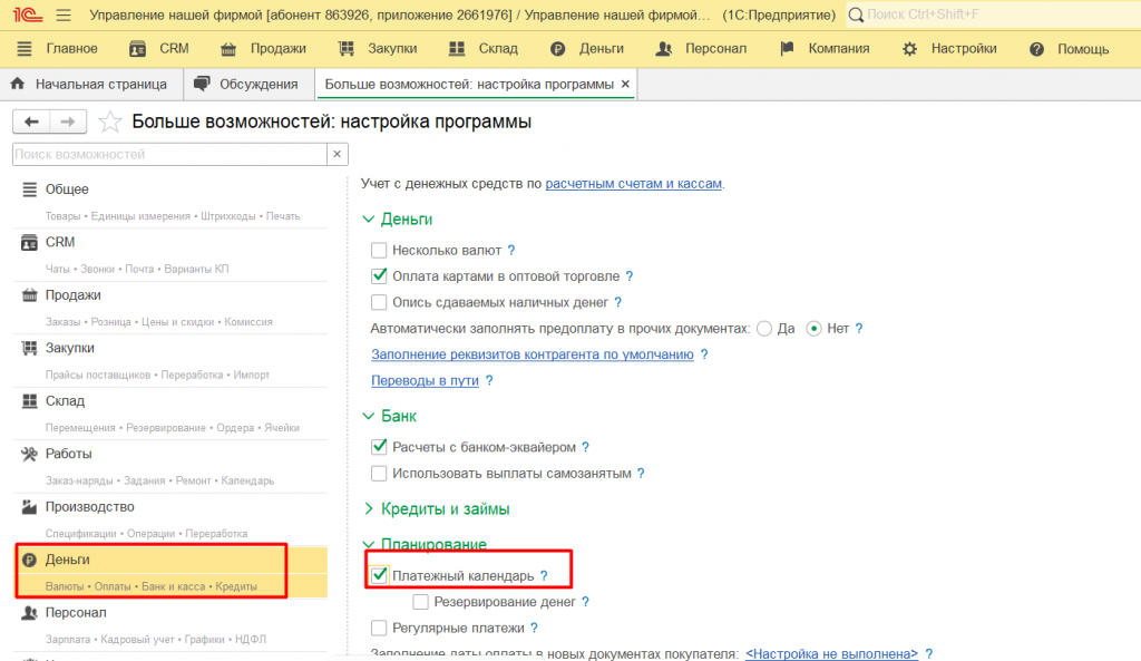 Для использования функционала планирования денежных средств и в частности, для планирования перемещения денег необходимо выполнить настройку. Для этого переходим в настройки подсистемы Деньги и включаем функциональную опцию Платежный календарь.