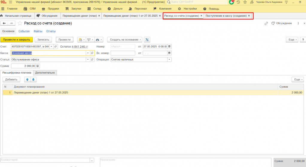 Будут одновременно созданы два документа. Так как в нашем случае план расхода был из счета в кассу, то создались документы Расход со счета, и, соответственно, документ Поступление в кассу. Документы заполнилась автоматически, остается лишь провести их.