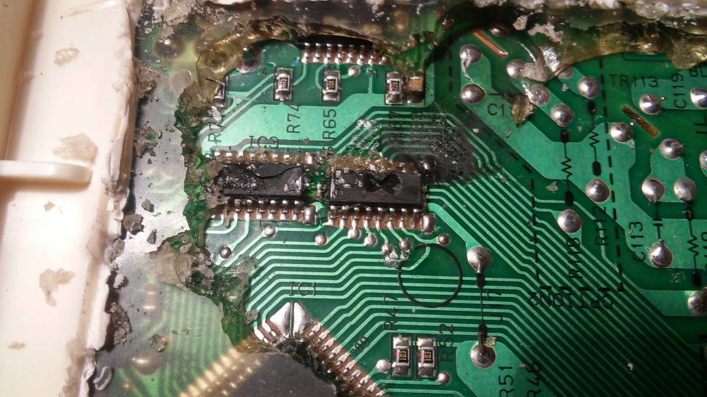 Микроконтроллер, по всей видимости, ещё жив - блок индикации, подключённый к нему напрямую, выжил. Вот так выглядит пластик после "археологических раскопок". Паяльник делал проходы миллиметр за миллиметром. Вы уже представили этот запах расплавленного пластика? Неровные края - цена доступа к плате, которую производитель намертво залил компаундом со всех сторон, сделав блок полностью неремонтопригодным.