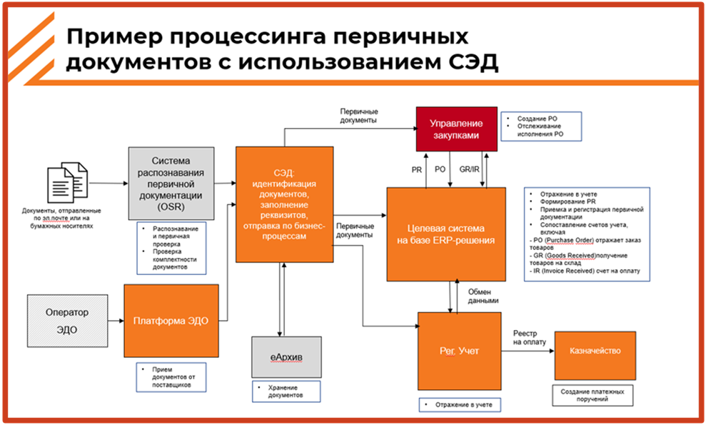 Как это работает в документообороте: корпоративный СЭД принимает через распознавание первичную документацию, берет документы из ЭДО и начинает двигать по процессу – в Directum, в ELM.
