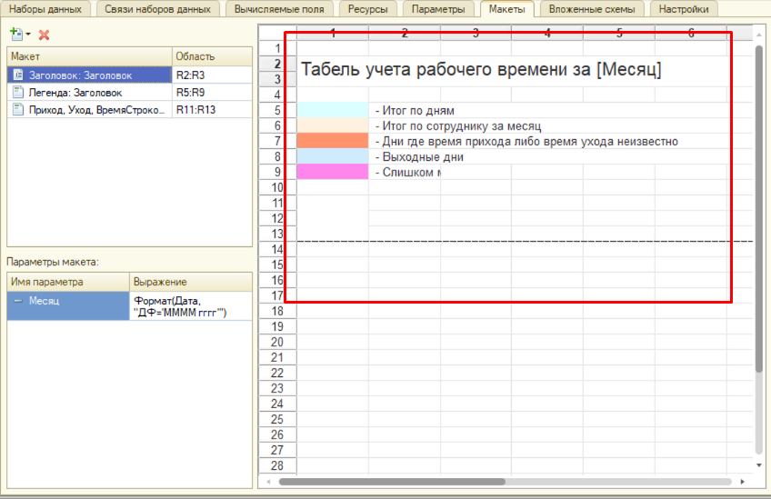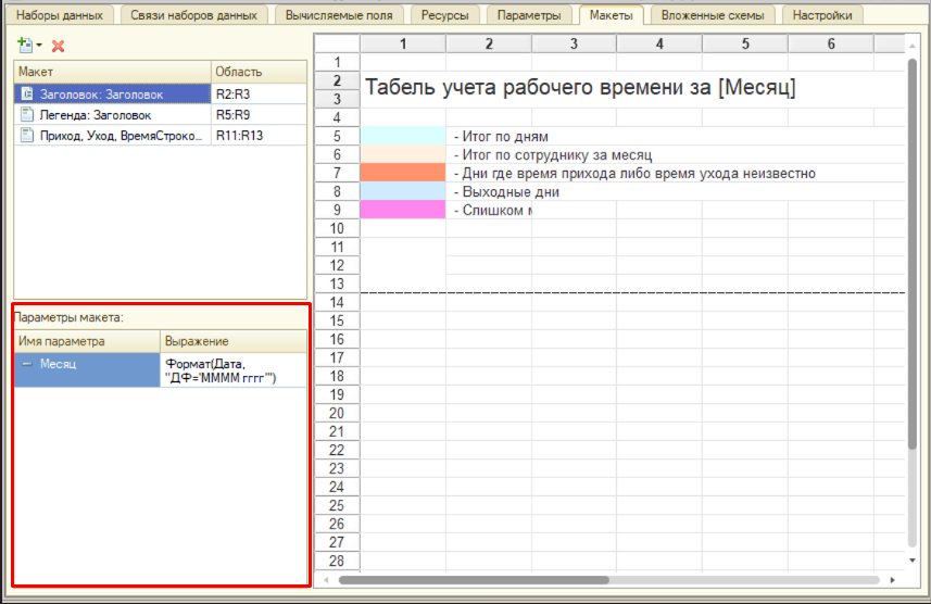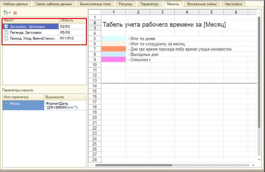 Разберем подробнее, первая строка "Заголовок". Это область макета с надписью "Табель учета рабочего времени за [Месяц]", где  [Месяц] является параметром и заголовок - это обозначение, что данный макет будет располагать в самом начале отчета.