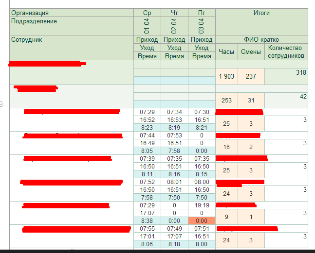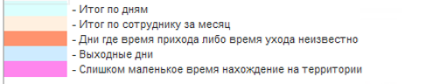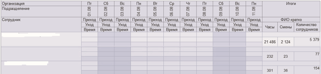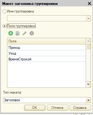 В первых двух строках нет ничего сложного, а вот далее немного посложнее. Была создана строка для создания группировки нескольких полей. А это "Приход", "Уход" и "Время строкой".