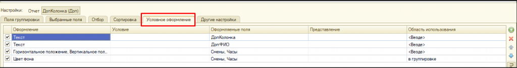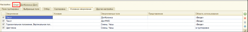 В третьей строчке "Оформление" указано "горизонтальное положение" и "вертикальное положение", при области использования на весь отчет. Здесь мы говорим отчету, чтобы во всех полях отчета, где отображаются "Смены" и "Часы", было заданное нами выравнивание.