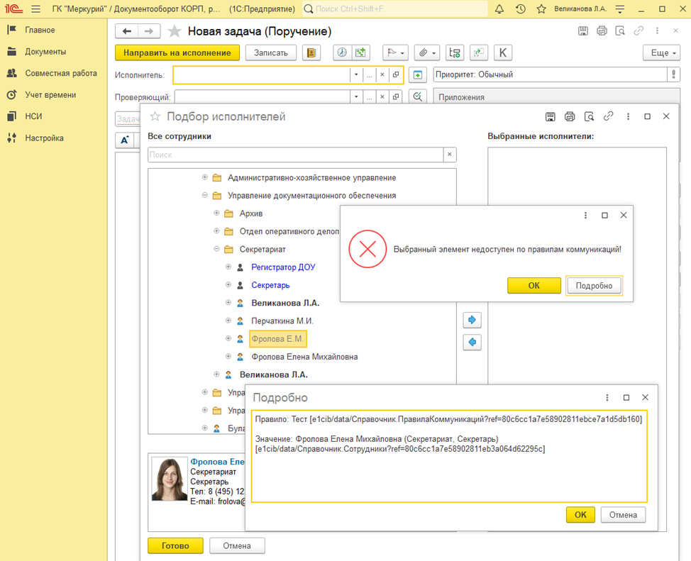 Правила коммуникации не дают выбрать сотрудника, который доступен по правилам.