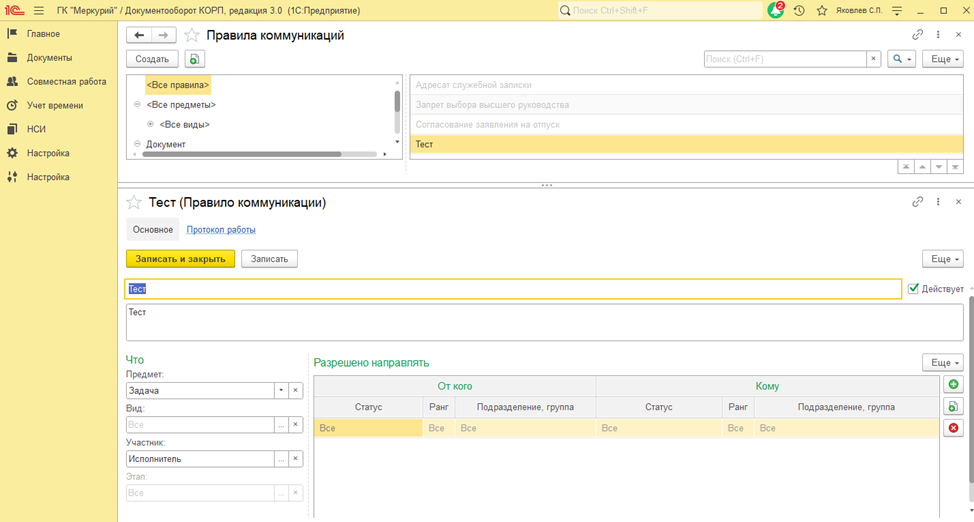 Для наглядности я выключил все правила и создал одно действующее правило, где разрешено направлять Задачи от всех всем: