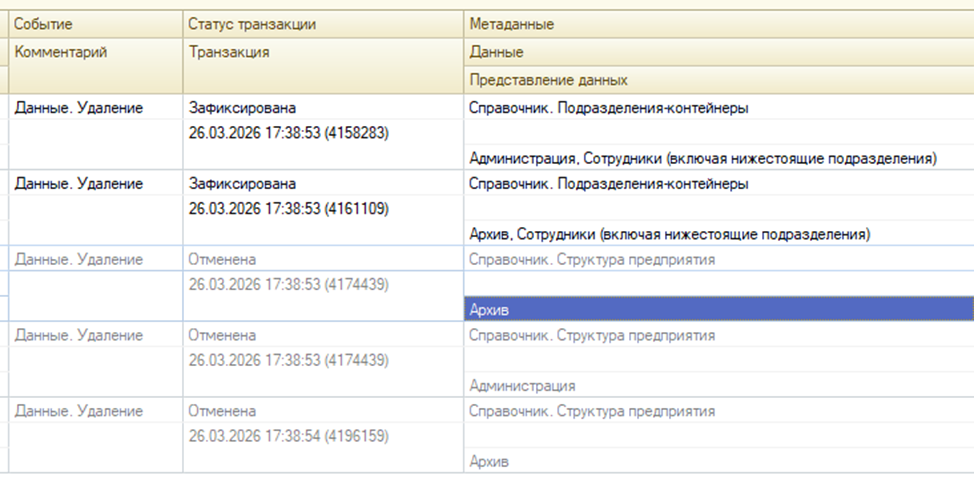 Отладчик показал, что при отработке правил строится запрос к справочнику «ПодразделенияКонтейнеры». Так как данный справочник подчинён справочнику «Структура предприятия», при пометке на удаление в «Структуре предприятия» помечаются на удаление и подчинённые элементы в справочнике «ПодразделенияКонтейнеры». А при удалении помеченных объектов «ПодразделенияКонтейнеры» беспрепятственно удаляются, независимо от того, получилось ли удалить владельца.