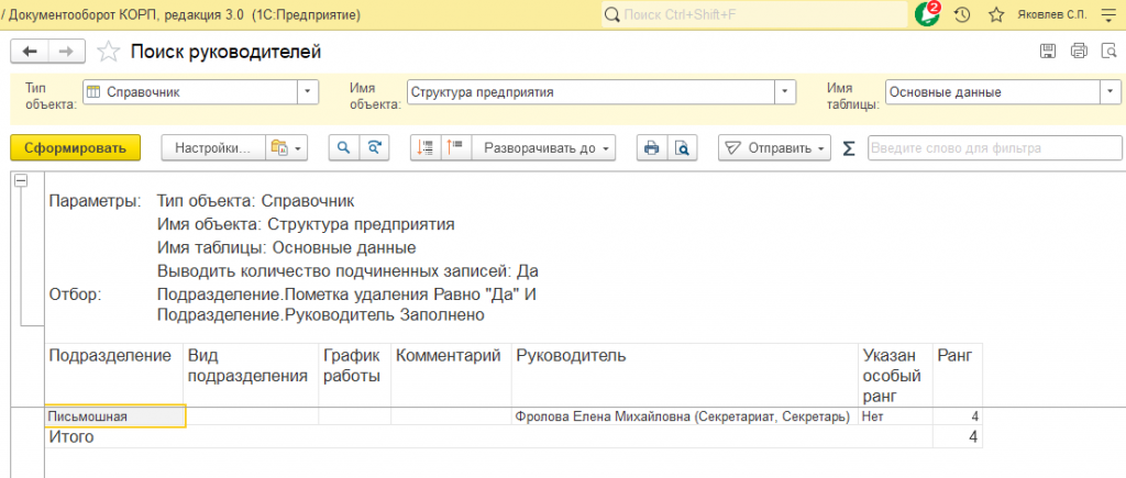Формируем отчёт и видим, что Фролова числится в помеченном на удаление подразделении «Письмошная»: