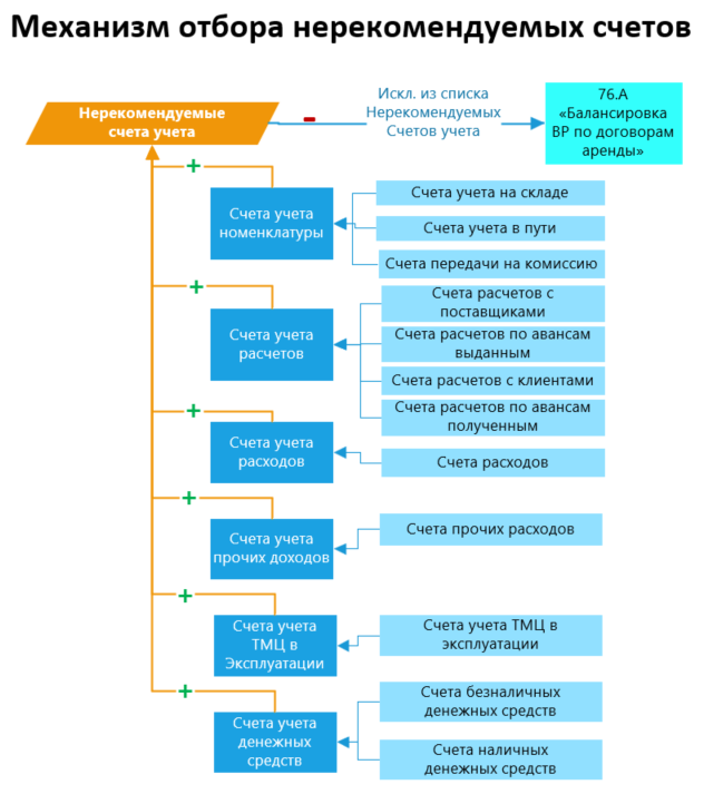 Важно: список зависит от конкретной настройки плана счетов (субконто, иерархия счетов и т.д.). Поэтому его рекомендуется переформировать после внесённых изменений в план счетов. После обновления конфигурации (особенно крупных, с появлением новых документов) может потребоваться актуализация запроса. В этом случае разработчику или аналитику стоит проверить функцию НерекомендуемыеСчетаУчета() в модуле менеджера документа «ОперацияБух» и сверить логику с запросами в обработке «Отражение документов в регламентированном учете». При необходимости — внести изменения в представленный запрос.