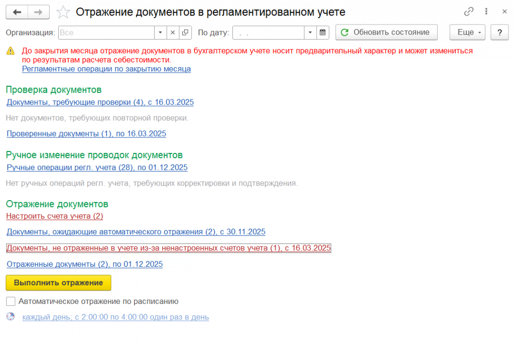В типовой 1С:ERP (в нашем примере релиз 3.2.7.11) существует обработка «Отражение документов в регламентированном учете». В ней реализованы функции, которые возвращают доступные счета для разных видов учёта: