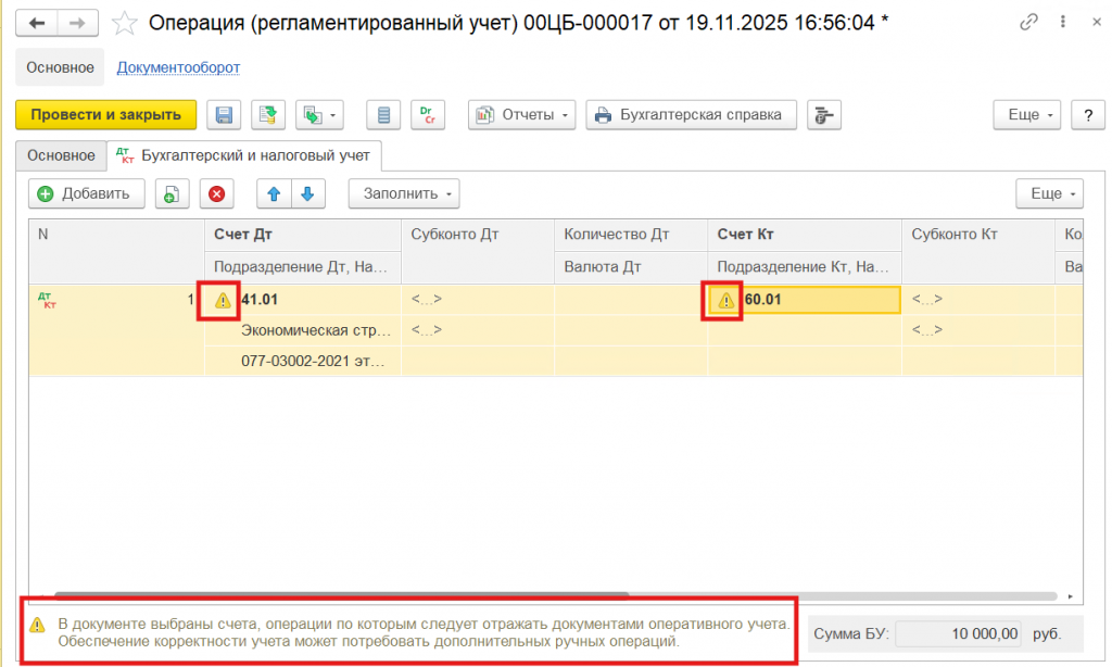 Рисунок 2. Документ «Операция (регламентированный учет)» с предупреждением о неправильном использовании счета.