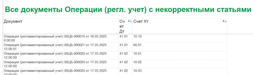 Рисунок 5. Пример вывода результата внешнего отчета «Отбор всех операций с неправильными счетами».