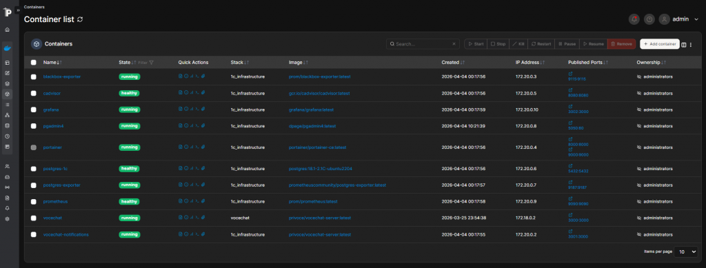 | В Docker | PostgreSQL, pgAdmin, мониторинг, VoceChat | Изоляция, переносимость, лёгкий бэкап |