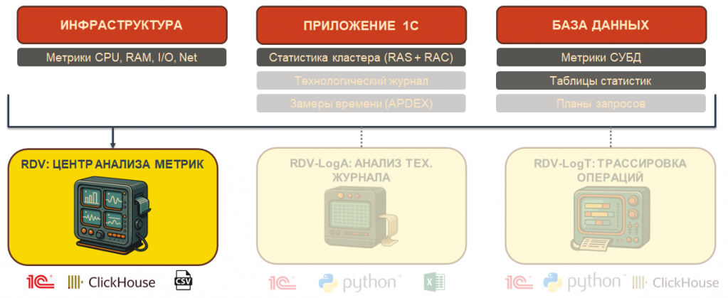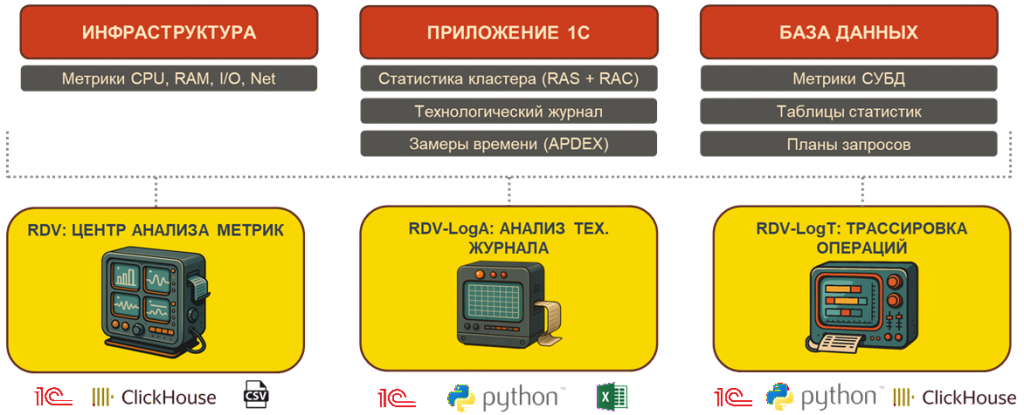 Приложение 1С – технологический журнал, замеры времени (APDEX), статистика кластера через утилиту RAC и сервер администрирования RAS.